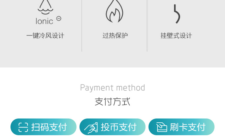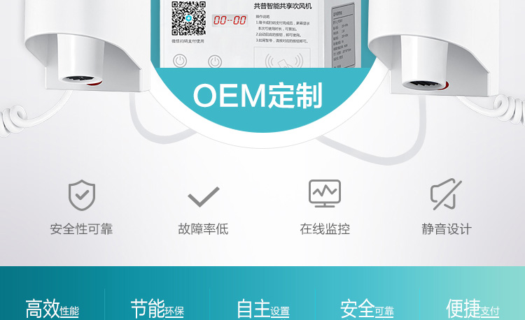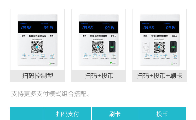 方案簡介: 為解決學校、工廠宿舍等人員居住量大的地方禁止使用大功率吹風機的問題,共享吹風機運營商可以跟學校協調進行統一安裝使用、統一管理,減少危險情況的發生。產品可使用掃碼、刷卡、投幣的支付方式,滿足各種場景所需。